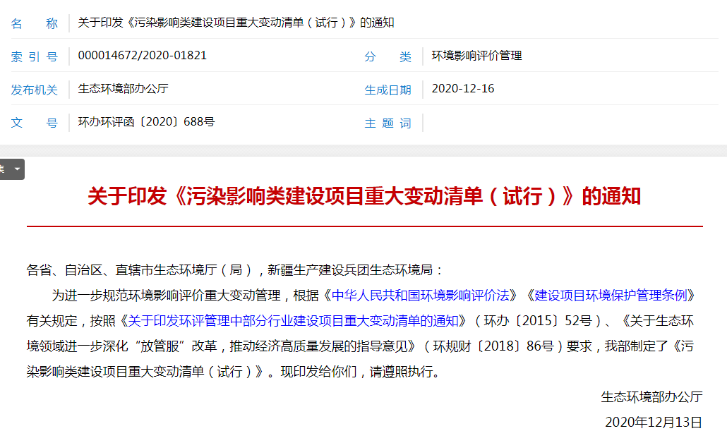 生態(tài)環(huán)境部發(fā)布《污染影響類建設(shè)項目重大變動清單(試行)》