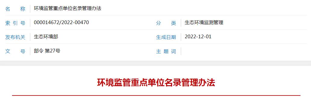 《環(huán)境監(jiān)管重點(diǎn)單位名錄管理辦法》已于2022年8月15日由生態(tài)環(huán)境部2022年第四次部務(wù)會(huì)議審議通過(guò),現(xiàn)予公布,自2023年1月1日起施行。